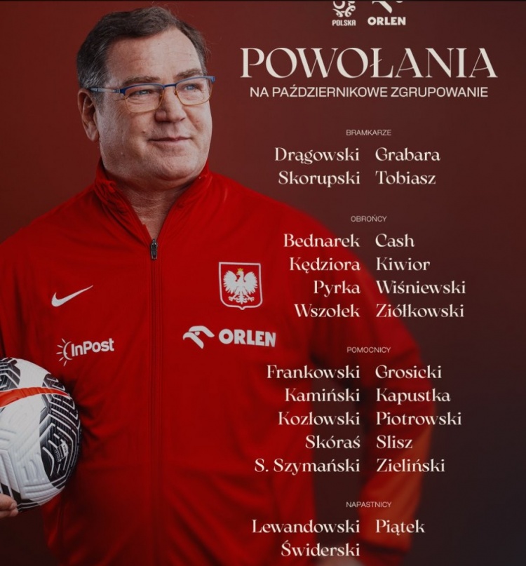 10月3日讯 今天,波兰足协在官方社媒公布了出征世预赛的国家队球员名单,莱万领衔,泽林斯基、基维奥尔在列。
