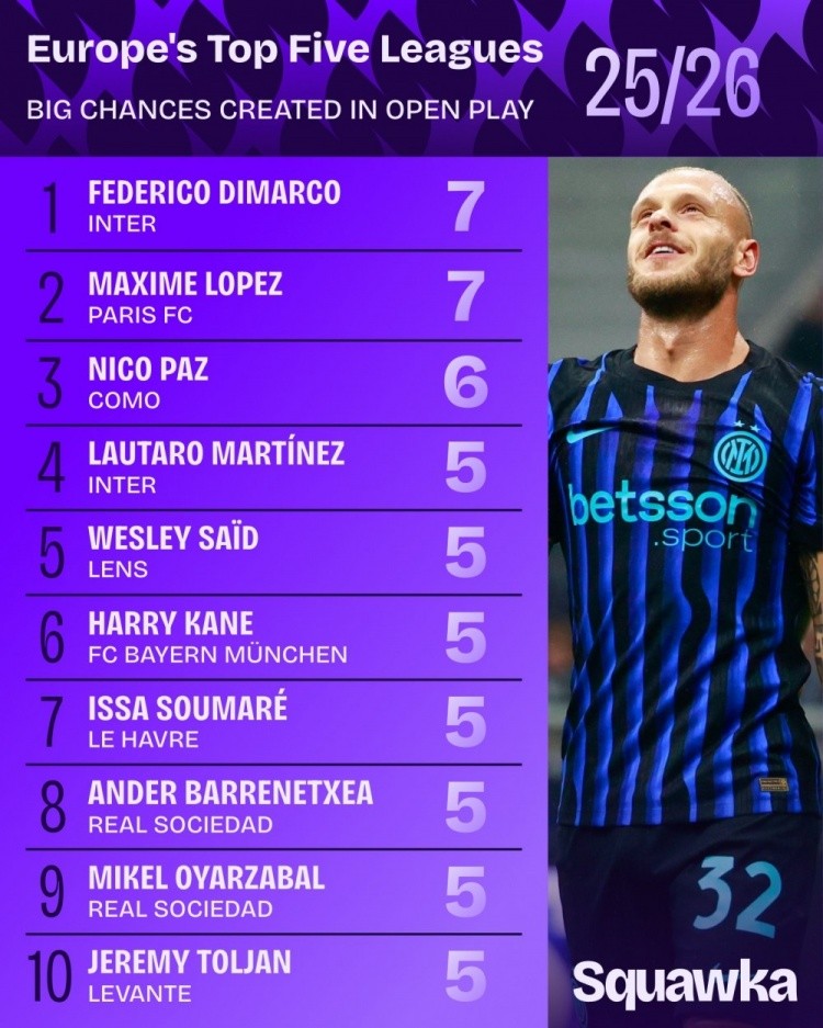 10月9日讯 Squawka统计了球员本赛季在五大联赛运动战中创造重大机会的次数,并列出榜单,迪马尔科、洛佩斯7次居首,尼科-帕斯6次第三。